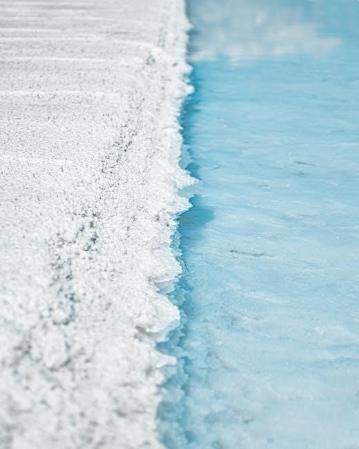 The salt cell is the core component of the PureChlor Salt System, responsible for converting salt into chlorine. It uses electrolysis to sanitize pool water, ensuring a safe and clean swimming environment. The cell consists of titanium plates coated with precious metals, which facilitate the chemical reaction. Regular maintenance, such as cleaning, is essential to prevent mineral buildup and ensure optimal performance. Cleaning every 3 months is recommended to remove scale and debris. Proper care extends the cell’s lifespan and maintains efficient chlorine production. Always follow the manual’s cleaning instructions to avoid damage and ensure the system operates effectively.